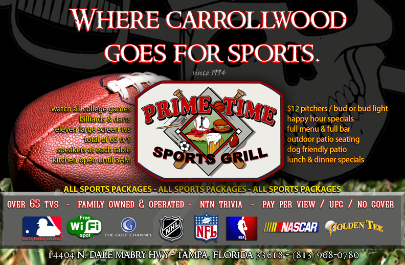 Prime Time Sports Grill located in Beautiful Tampa, Florida. Carrollwood's favorite, family friendly sports grill! Over 40 Tvs giant screens, individual speakers at each table. Great food, cold brew, NTN trivia.Hang out with us!